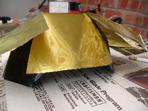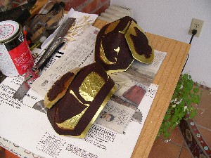 After the painting, and brass embossing and wrapping, the two pauldron styles come back