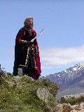 The Trip to Middle Earth ~ 2003 ~ Chapter 4 ~ The REAL Return of the King.To conserve space these photos are small. Mail me if you want the hi-rez image. If Hobbiton and Wellington were my special destinations, today marks the beginning of the trip for Phil. At last we will be in Rohan. His Hobbiton dream didn't work out due to the rain, but he will follow his heart at Edoras 'to whatever end'. Of course this is also the day my notebook diary breaks down a bit. So I will look at the photos and try to recall what I can of December 3, the real return of the King...Theoden. The day started a bit dreary as I recall, but maybe that was just because I was contemplating my first role of the day 'Theoden's esquire', though valet would have been more like it, as I rolled up the outfit and got it all into my pack while listening to the usual helpful comments, "It won't all fit in there!" "You're crushing my velvet!!" "Don't forget my brooch." Just call me Sherpa. Thanks to the Fabulous Doloreses we at least have a seat on the bus as we headed out to Rakaia Gorge on the way to Mt. Potts Station.
