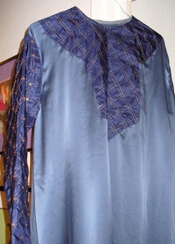The blue undertunic is silk charmeuse with buttons on the front closing. The charmeuse was cut with the 'shiny'