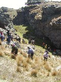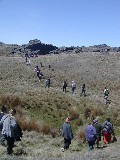 The coach begins to hiss with the sound of zip-off trouser legs zipping off. After the usual bio-breaks, we head for the hill. Crossing the first rivers are easy, but as luck would have it the Sherpa looked over her shoulder to answer someone and goes in ~ PLUNK! I sit there unable to get up because I'm trying to keep the boots dry! Finally Phil and Robert stop trying to 'save' me and take the boots. Then I can get up and slog out of the water. Brisk! Refreshing! Boy am I glad the sun has come out!